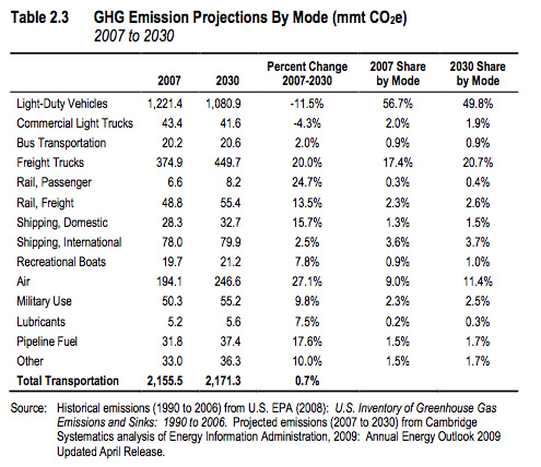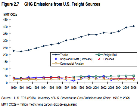 Freight trucks, on the other hand, show a projected 20 percent increase in emissions, even though freight truck VMT grows at a similar rate to light-duty vehicles. Comparing transportation modes, the share of GHG emissions from freight trucks is increasing faster than any other mode. [U.S. DOT, op. cit., pg. ES-2-26.]