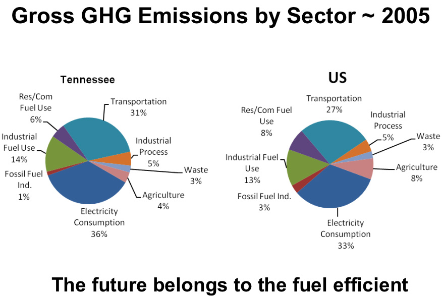 In the chart, above, you can see that the transportation sector in Tennessee is by far the fastest growing source of CO2 emissions compared to all other economic sectors. That growth in CO2 emissions is expected to accelerate over the 2005-2025 period. In the chart below, you can see that Tennessee is not that different from the U.S. in its distribution of CO2 emission sources.