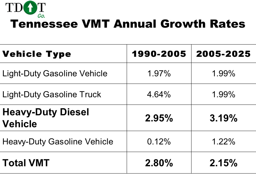Measurement of transportation growth is measured in Vehicle Miles Traveled (VMT). Annual VMT growth for heavy-duty trucks in Tennessee is not only the highest in the transportation sector--it outstrips all other classes of vehicles by 50%.